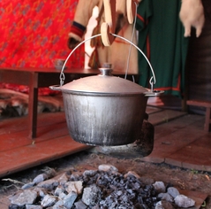В каждой этнодеревне гостей встречают блюдами национальной кухни. В ауле можно попробовать конину, баурсаки, бешбармак.